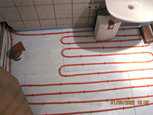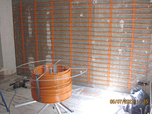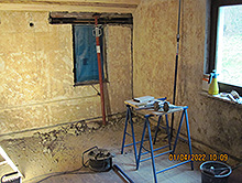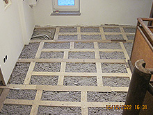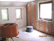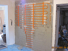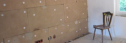 Anbringen einer Dämmung, Holzfaserplatten an Außenwänden im Innenbereich für die Montage und Verlegung von Leitungen für Flächenheizungen im Gang und allen Räumen, Bad mit Fußbodentemperierung.