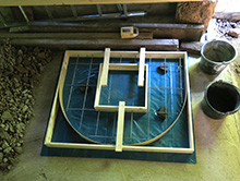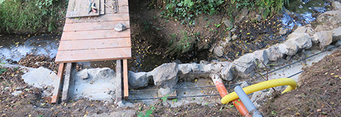Versetzen des Bachlaufes mit Aufbau einer Natursteinmauer.